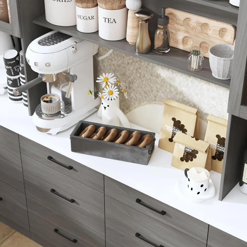 - [Stylish Kitchen Pantry] – Gray wood grain pantry with white countertops looks modern and stylish, suitable for any interior style and any place. Add a premium and elegant vibe to your room and update your room decor. Open shelves allow for better display of your collections