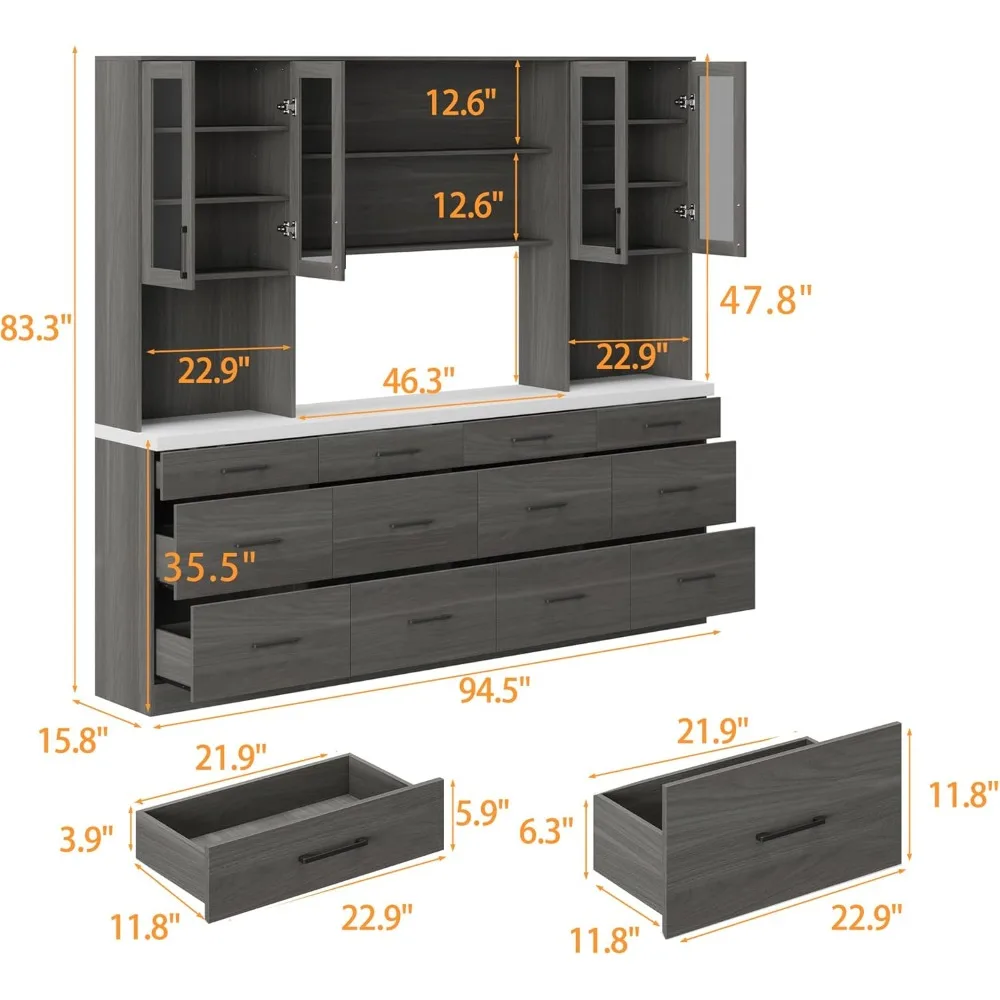 94.5″ W Kitchen Pantry with Countertop, 12 Drawers & 4 Glass Doors, Modern Wooden Cupboard Storage Cabinet with 6 Hidden Shelve