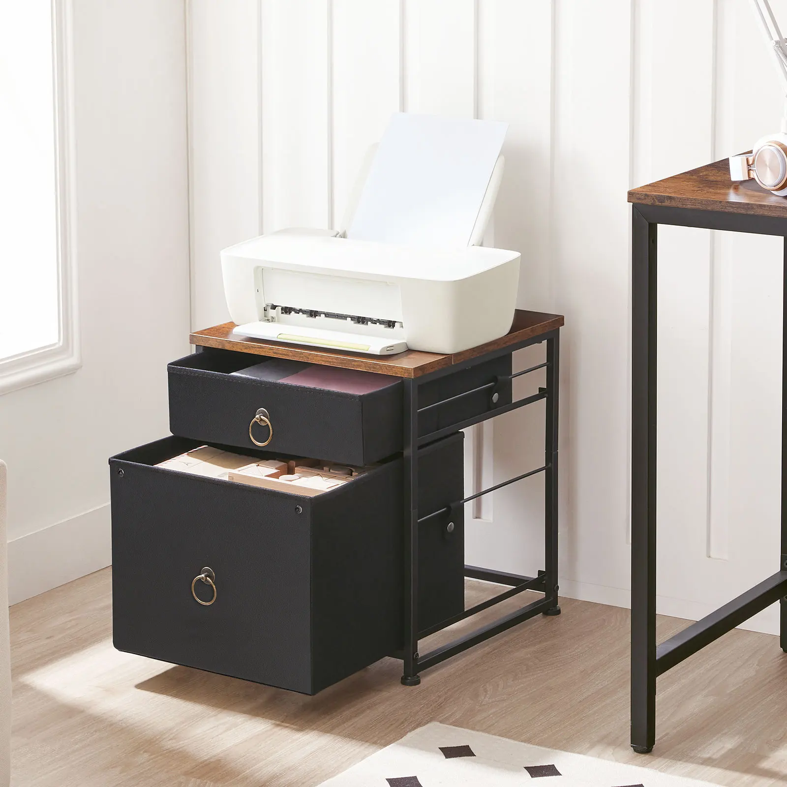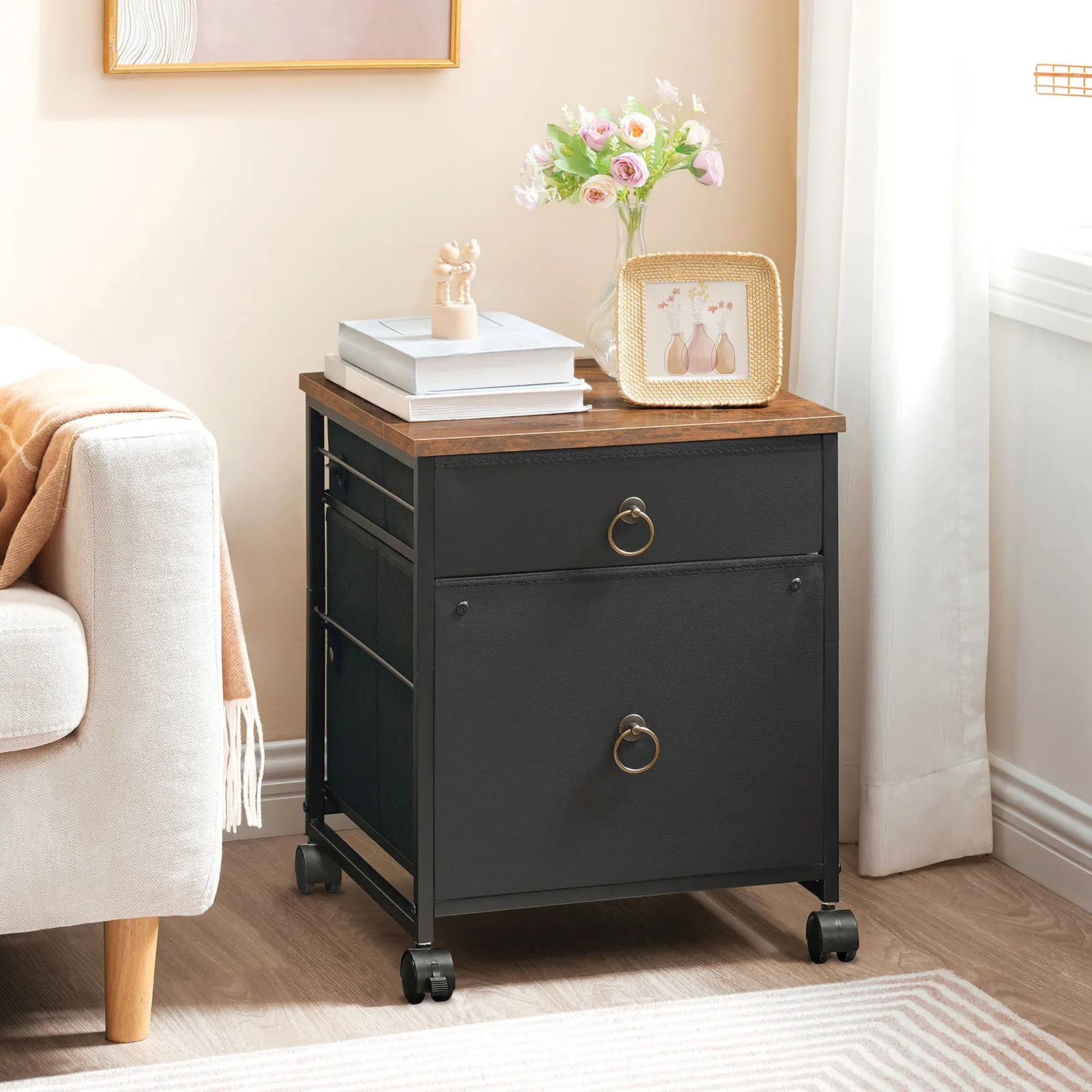 Industrial Design: With calm black drawers and rustic brown panel plus firm metal frame and metal pull rings, this filing cabinet attracts your eyes for its strong industrial vibe, classical charm and the beautiful smooth grain texture