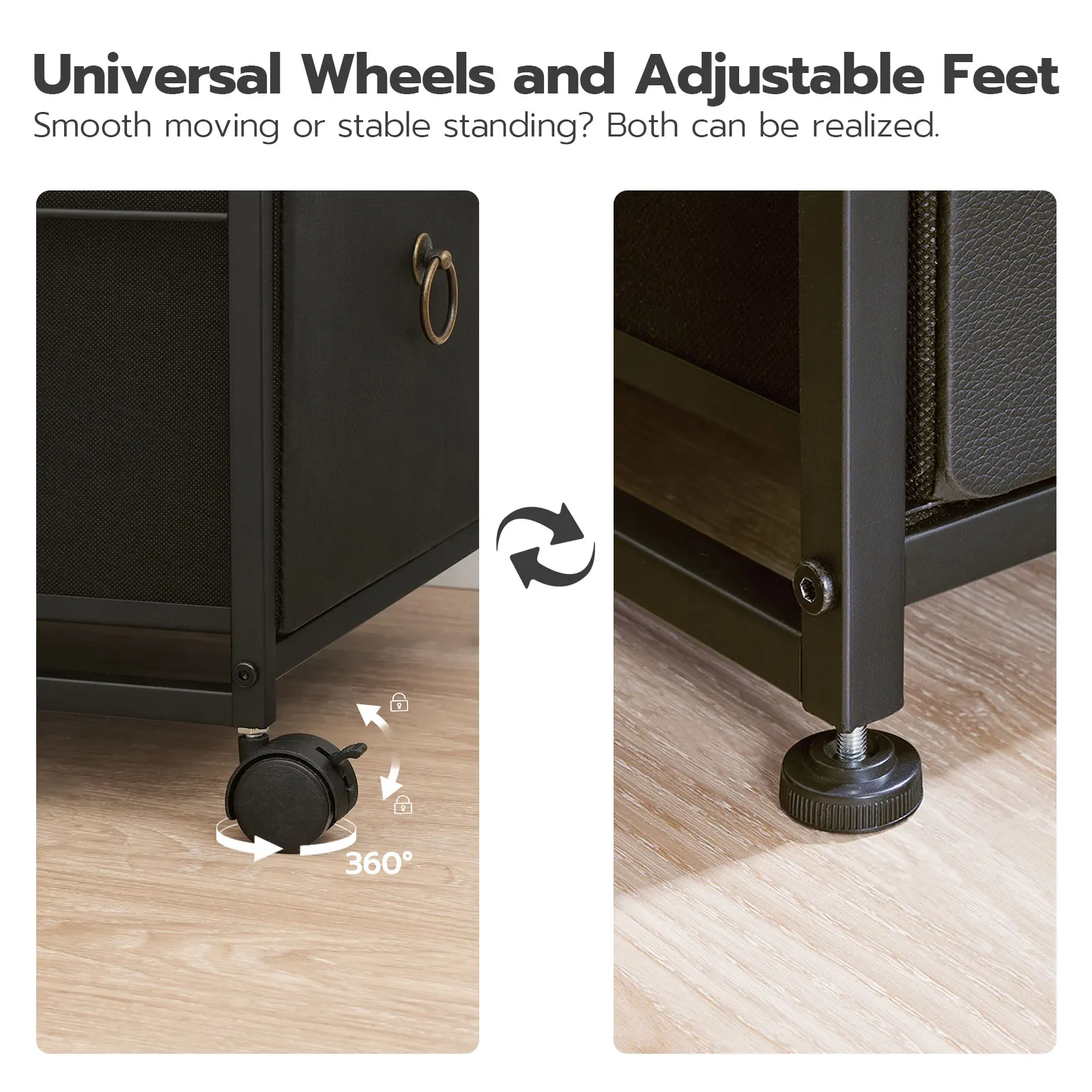 Two Installation Methods: This filing cabinet comes with 4 universal wheels (2 of which are lockable) and 4 adjustable feet. You can choose to move the file cabinet freely or keep it fixed in one place, providing multiple options and flexibility